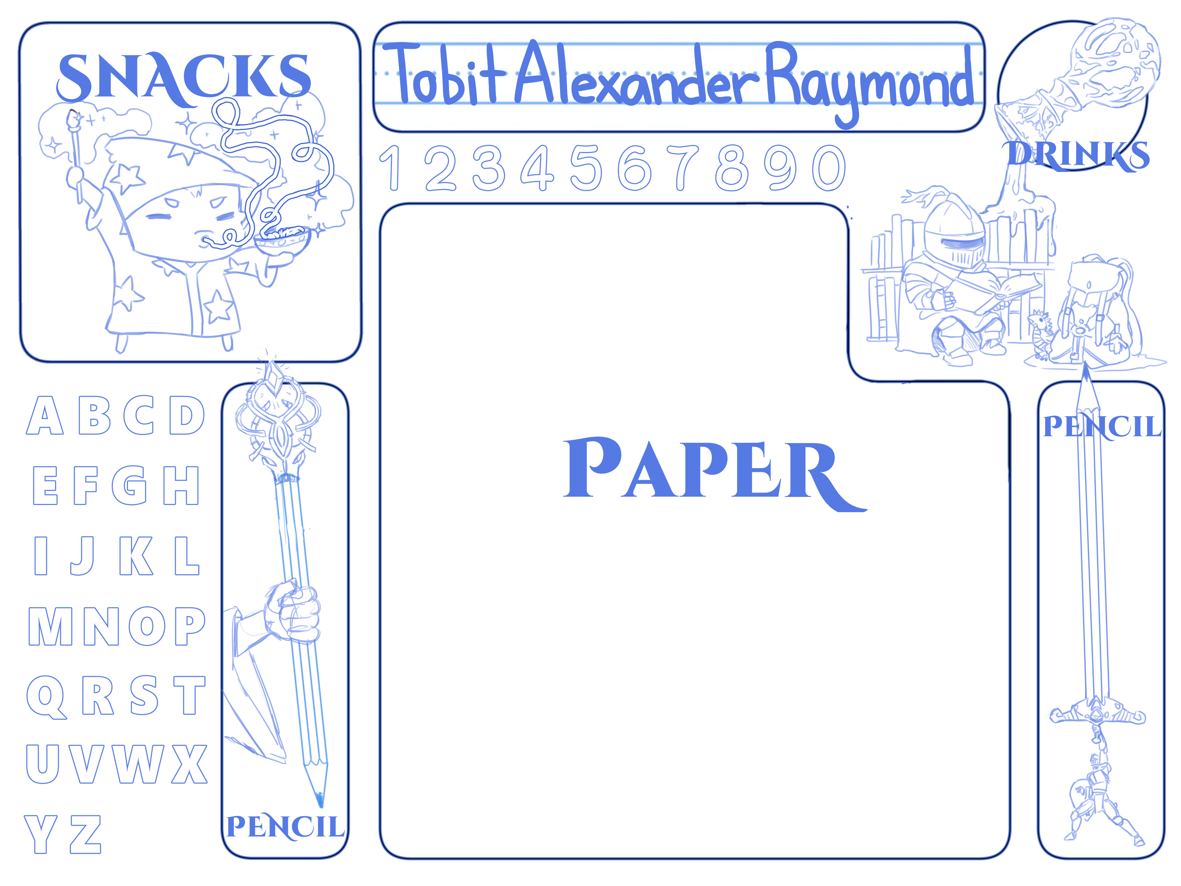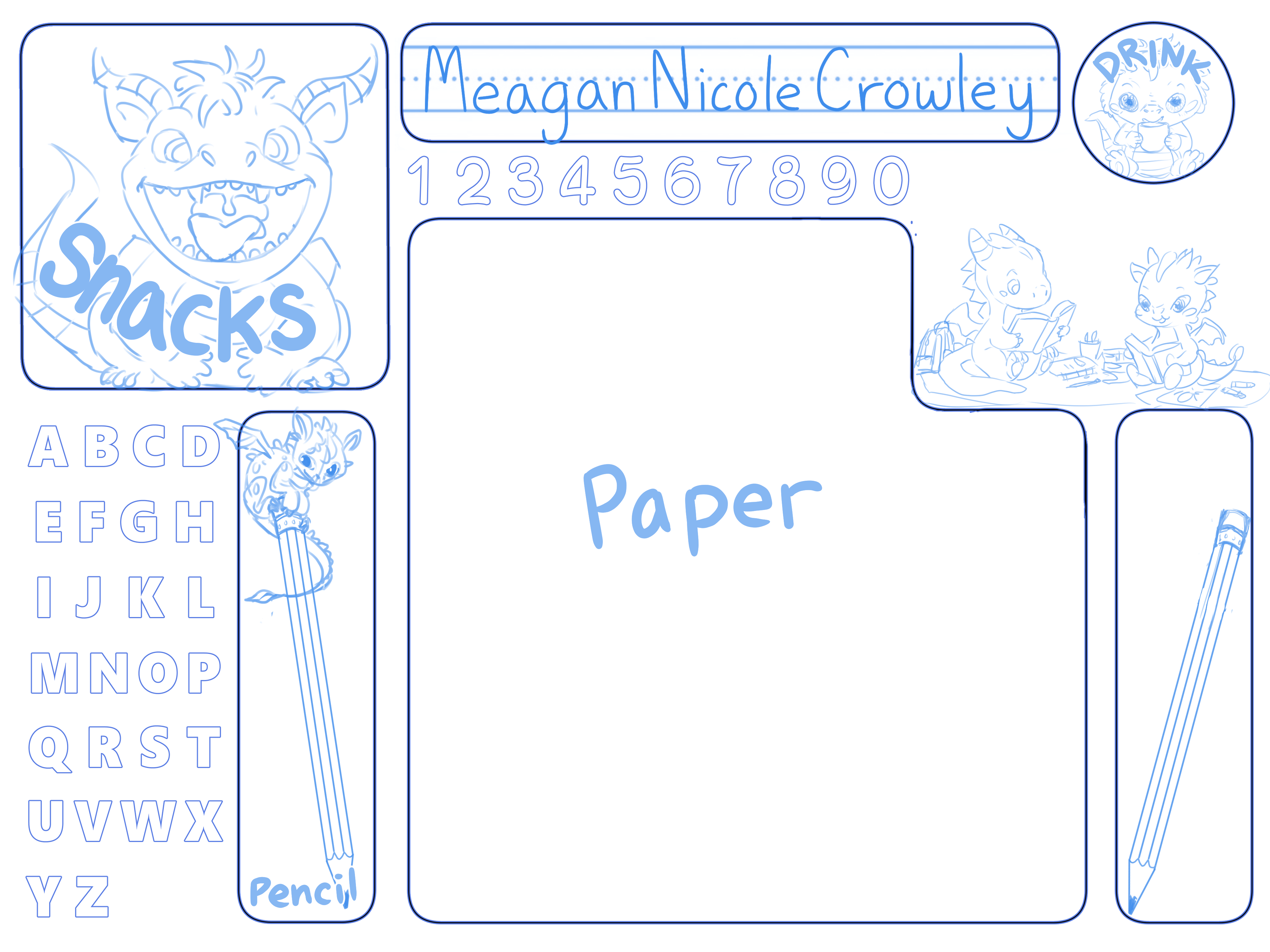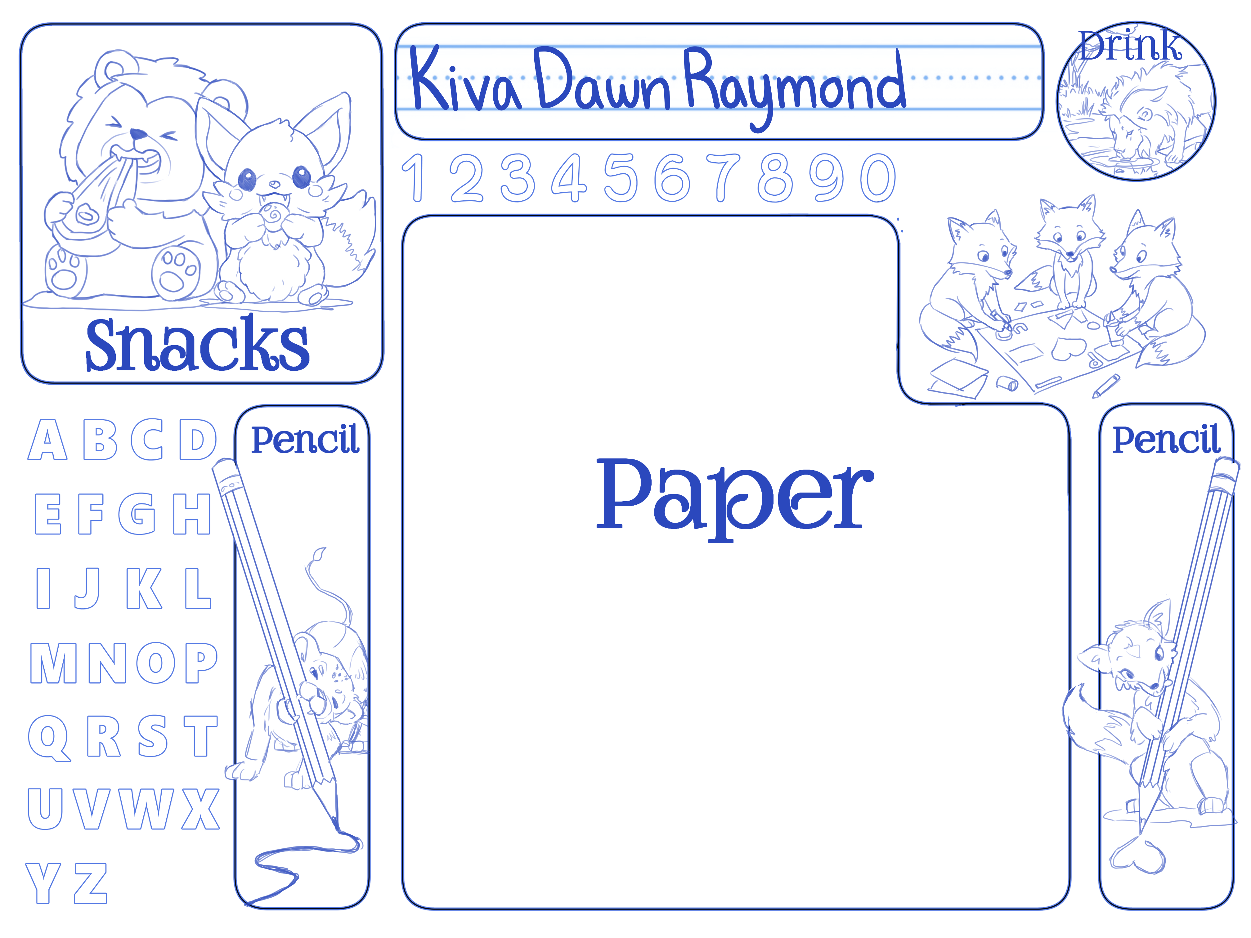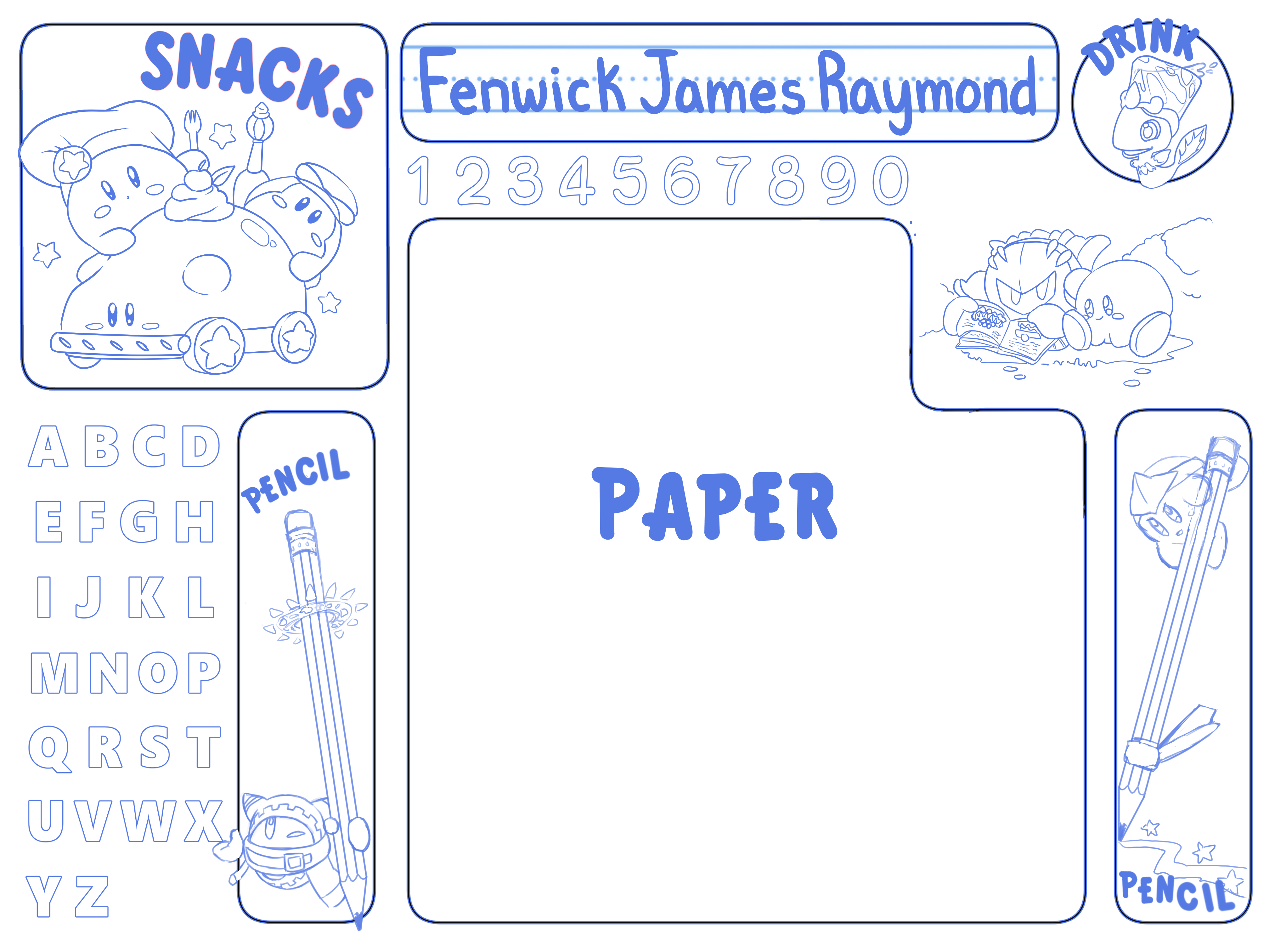 Just an idea I had to try to organize our desks in a cool customized way. each kid picked out a theme and I drew or traced the best cartoons onto the page so it’s like a collage I just made it cohesive by redrawing the lines of the art 😛
